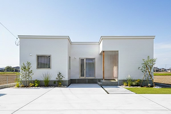 白い外壁を基調に、ナチュラルな色味で優しくモダンな印象の縦格子をアクセントとして加えました。