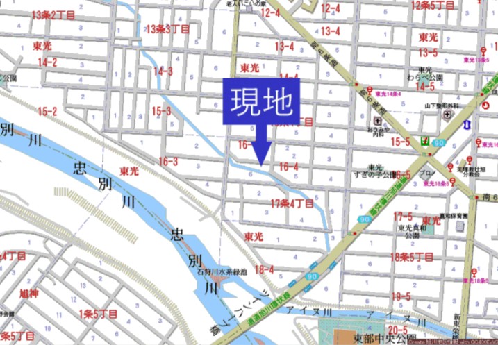 | 備考 | 住所:旭川市東光16条4丁目6 (地番:370-201,370-203) ※敷地内の樹木は9月中に抜根して撤去予定です ※間口左の境界から、約4.8mの位置に電柱があります |