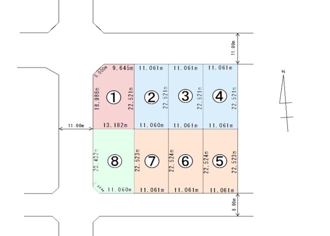 | 備考 | 住所:旭川市豊岡6条3丁目3 8区画 ①角地 隅切り5.000m ⑧角地 隅切り2.999m ※電柱・支線移設に関し現在協議中となっております ※分筆登記中につき面積・辺長が変わる場合がございます |