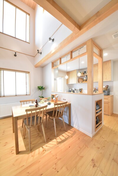 高い窓からたっぷりの自然光が差し込み、家族が集まる食卓をいつでも明るく、ぽかぽかと温かく照らしてくれます。