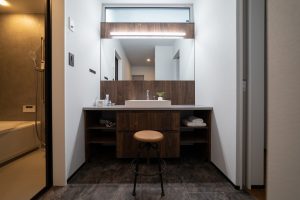 回遊動線上にある洗面化粧台は幅160cmの人気のアイカのスマートサニタリー
