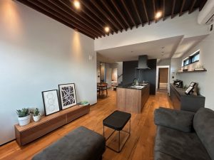 リビングの天井は一部を3メートルまで上げて、解放感と広がりを演出しています。