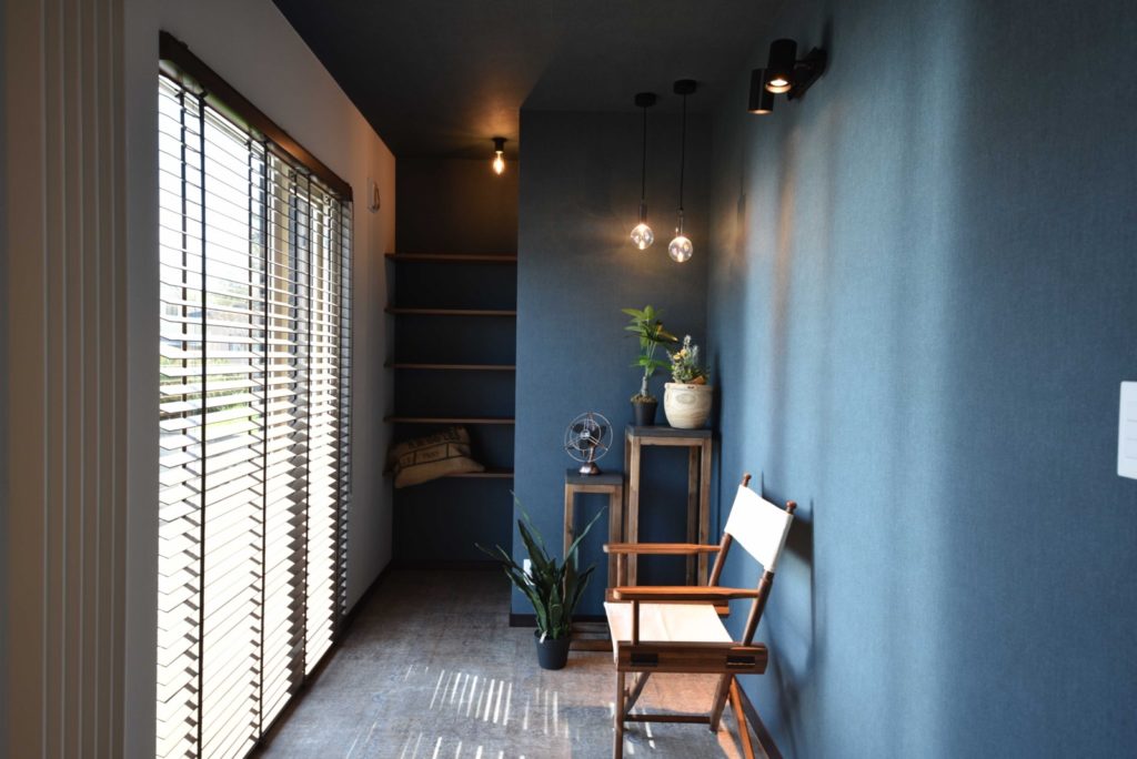 デニム生地の様なテクスチャーがオシャレで、落着いた空間のサンルーム。