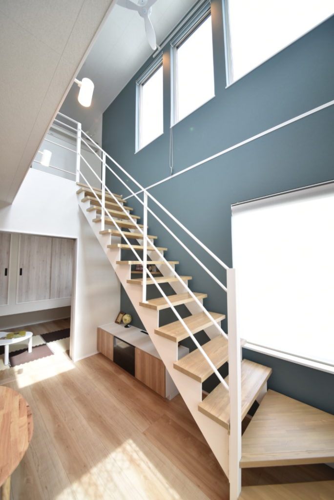 吹き抜けとさらし階段で明るく解放的な空間に…。