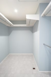 ウォークインクローゼットはハンガーに干したものが乾いたあとすぐかけられるようにと【かける収納】をメインに、一部分のみお子様のお洋服や丈の短いものをかけられるようにステンパイプを2段にさせていただきました。