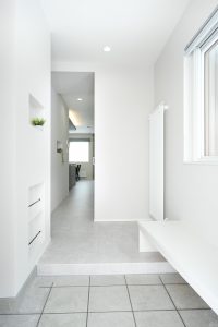 玄関に入ると大きな窓があり、日光も取り入れられる空間です。玄関にはこだわりポイントがたくさんあり、靴を脱ぎ着したり、お子様を一時的に座らせられるベンチを付けていただきました。最近インスタグラムで有難いことにご好評なCOZY末広東平屋モデルに付けたベンチはこちらのお客様からや他のお客様からのベンチのご希望が多かったことにより実現したものだったので、是非こちらのおうちでも体感してみてくださいね。