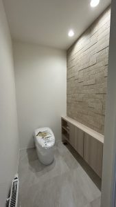 トイレはゆったり入れるように通常よりも幅を広く設けて、収納も造作で作らせていただきました。何かとしまう物が多いトイレスペースですが、用途に分けて扉を付けたりオープンにしたり使い勝手にもこだわりました。カウンター上に貼ったエコカラットはデザイン性も機能的にもトイレ空間にピッタリです。