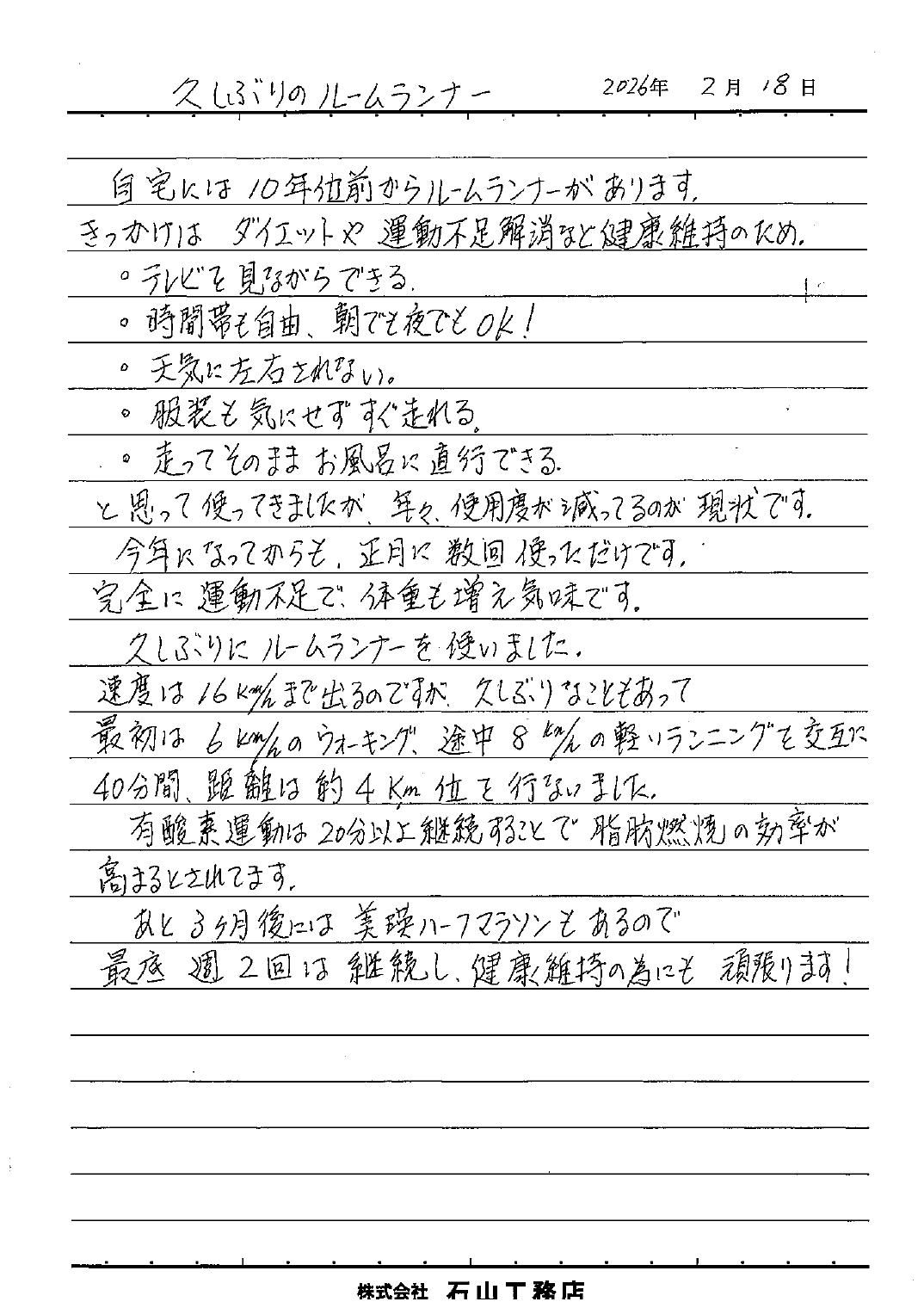 自宅には10年位前からルームランナーがあります。きっかけはダイエットや運動不足解消など健康維持のため。・テレビを見ながらできる・時間帯も自由、朝でも夜でもOK!・天気に左右されない・服装も気にせずすぐ走れる・走ってそのままお風呂に直行できる と思って使ってきましたが、年々、使用頻度が減っているのが現状です。今年になってからも正月に数回使っただけです。完全に運動不足で体重も増え気味です。久しぶりにルームランナーを使いました。速度は16km/hまで出るのですが、久しぶりなこともあって最初は6km/hのウォーキング、途中8km/hの軽いランニングを交互に40分間、距離は約4km位を行いました。有酸素運動は20分以上継続することで脂肪燃焼の効率が高まるとされています。あと3ヶ月後には、美瑛ハーフマラソンもあるので最低週2回は継続し、健康維持の為にも頑張ります!