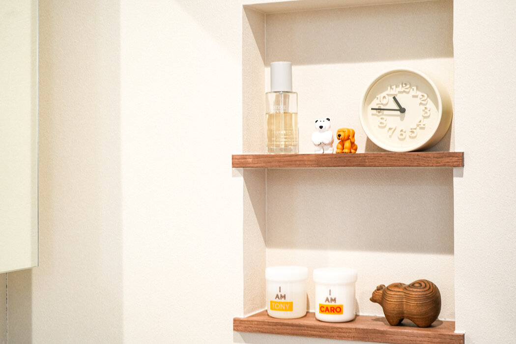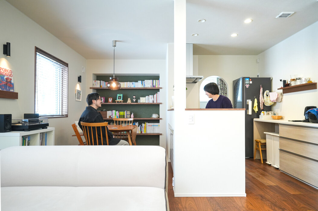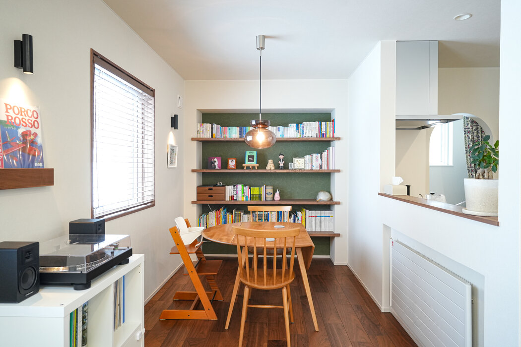 ダイニングには「見せて飾る」ことを意識した造作本棚を設置。好きな雑貨や本を飾りながら、家族の時間を楽しめる場所になっています。背面の深い緑の壁紙がアクセントとなり、空間に落ち着きを添えています。