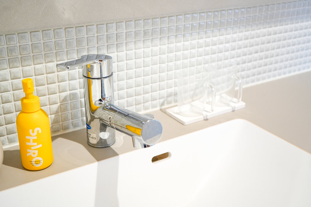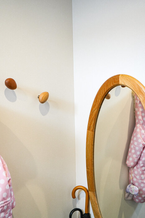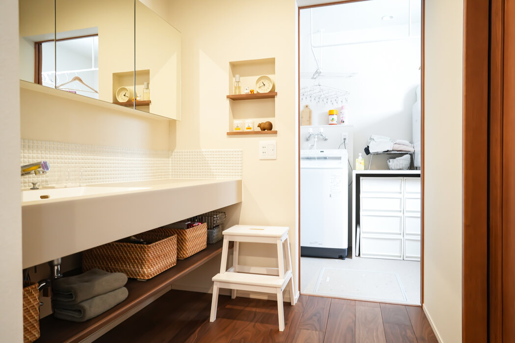毎日使う洗面スペースも、LDKの雰囲気に合わせて木の温もりを感じられるように仕上げ、家全体に統一感を持たせました。十分な広さを確保しているので、朝の身支度もご家族でゆったりと行えます。