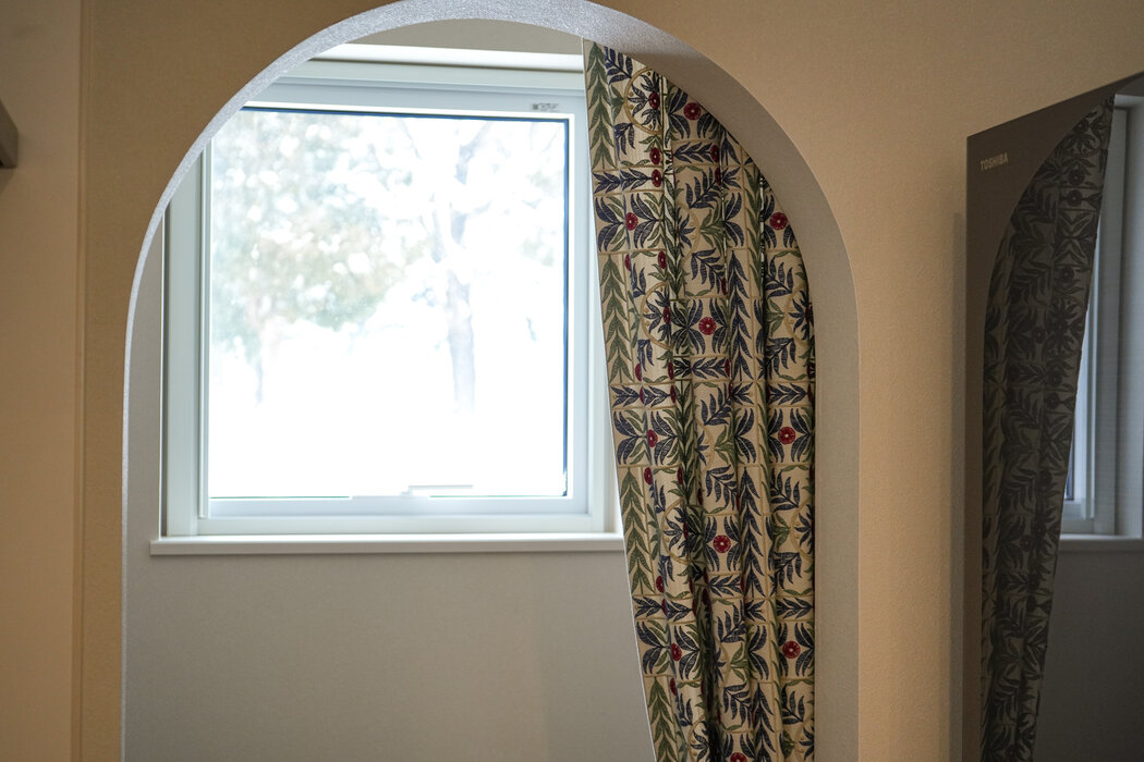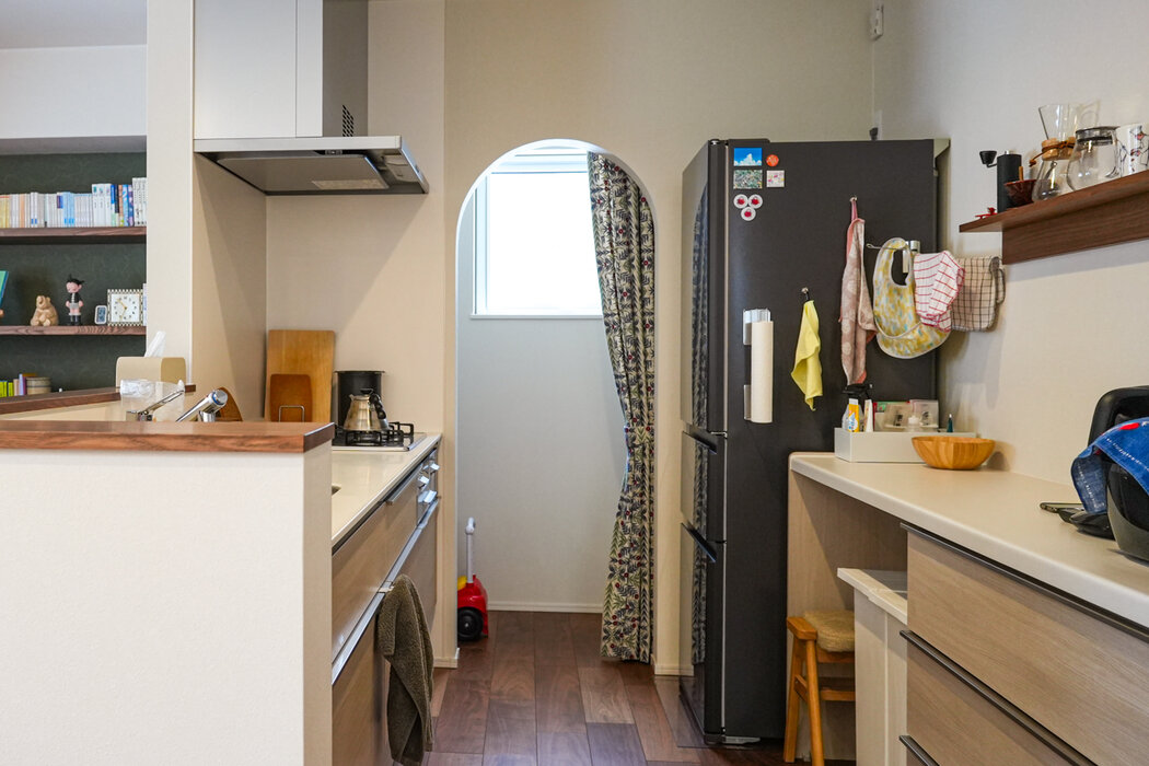 キッチンのすぐ横には、大容量のパントリーを配置。入り口を柔らかな曲線を描く「R開口(アーチ型)」にすることで、直線的になりがちなLDKの空間に優しいアクセントを加えました。使い勝手とデザイン性を両立させた設計となっております。