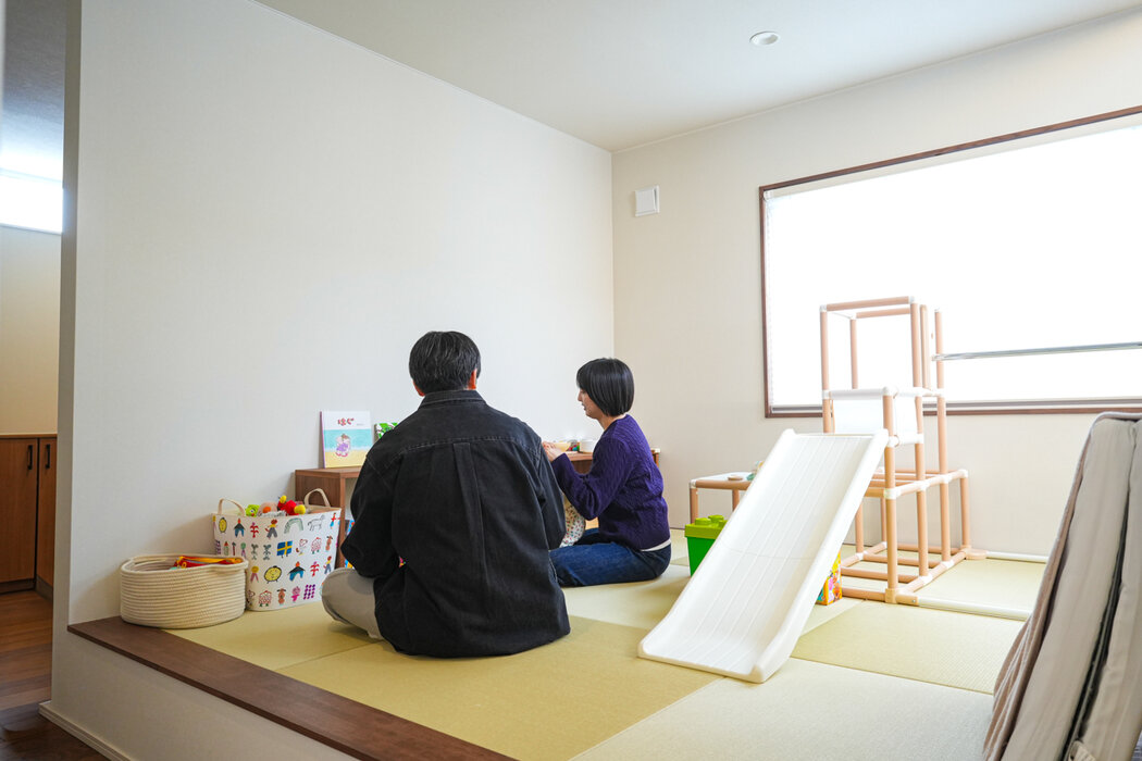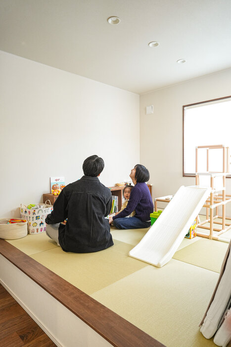 リビングとゆるやかにつながる小上がり和室は、家族が自然と集まるお気に入りの場所。上がり框に腰掛けたり、畳に座ったりと、思い思いの過ごし方ができます。お子様の遊び場としても活躍し、家族の気配を感じながら安心して過ごせる空間です。