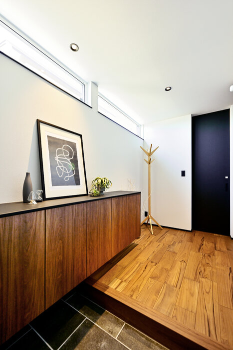 ■木の柔らかな質感を黒で引き締めた大人かっこいい空間一体のLDK空間で圧倒的な存在感を放っているのが、 ウォルナットの面材がグレード感を醸すアイランドキッチンです。 背面に設けられた収納を含め、カウンタートップにはハイグレードなセラミックを採用。 ダウンライトの光が優しくにじむ棚や、黒のアクセントウォールなどと相まって、 悠々自適の暮らしを象徴するかのような設えです。 玄関ホールやLDK、主寝室の床には世界3大銘木の一つといわれるチークを選択。 質感・色ともに柔らかみがありつつ、重厚さを空間に与えています。 さらに、キッチン横のアクセントウォールや建具だけでなく、 窓枠や窓台、巾木に至るまで黒を効かせたインテリアが秀逸。 窓の下端に施工されている窓台や、床と壁の境目を縁取る巾木は通常の半分ほどの 薄さにするなど、繊細な仕上げも美しく洗練されています。 静かで落ち着いた空気感が心地よく、ジャズが染み入るように流れてきそうなLDK空間。 ヘリンボーン柄のデザインウォールや間接照明など、ホテルのような非日常感が漂う主寝室。 どこを取っても"大人かっこいい"、そんな印象を受けるモデルハウスです。 |