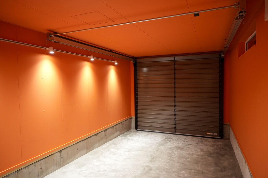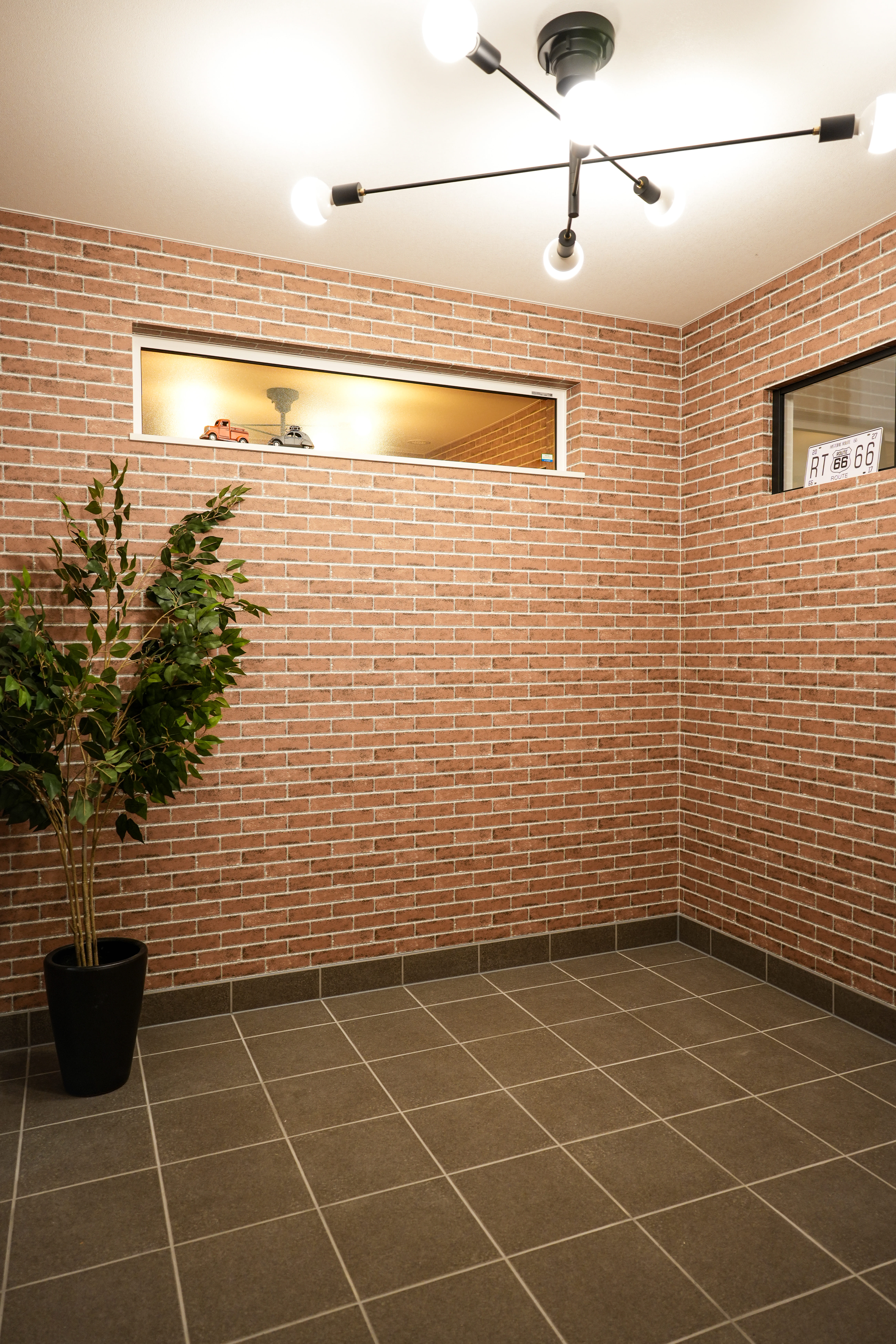 オレンジカラーの壁と照明が映える空間は、車好きにはたまらないとっておきの趣味室にもなります。