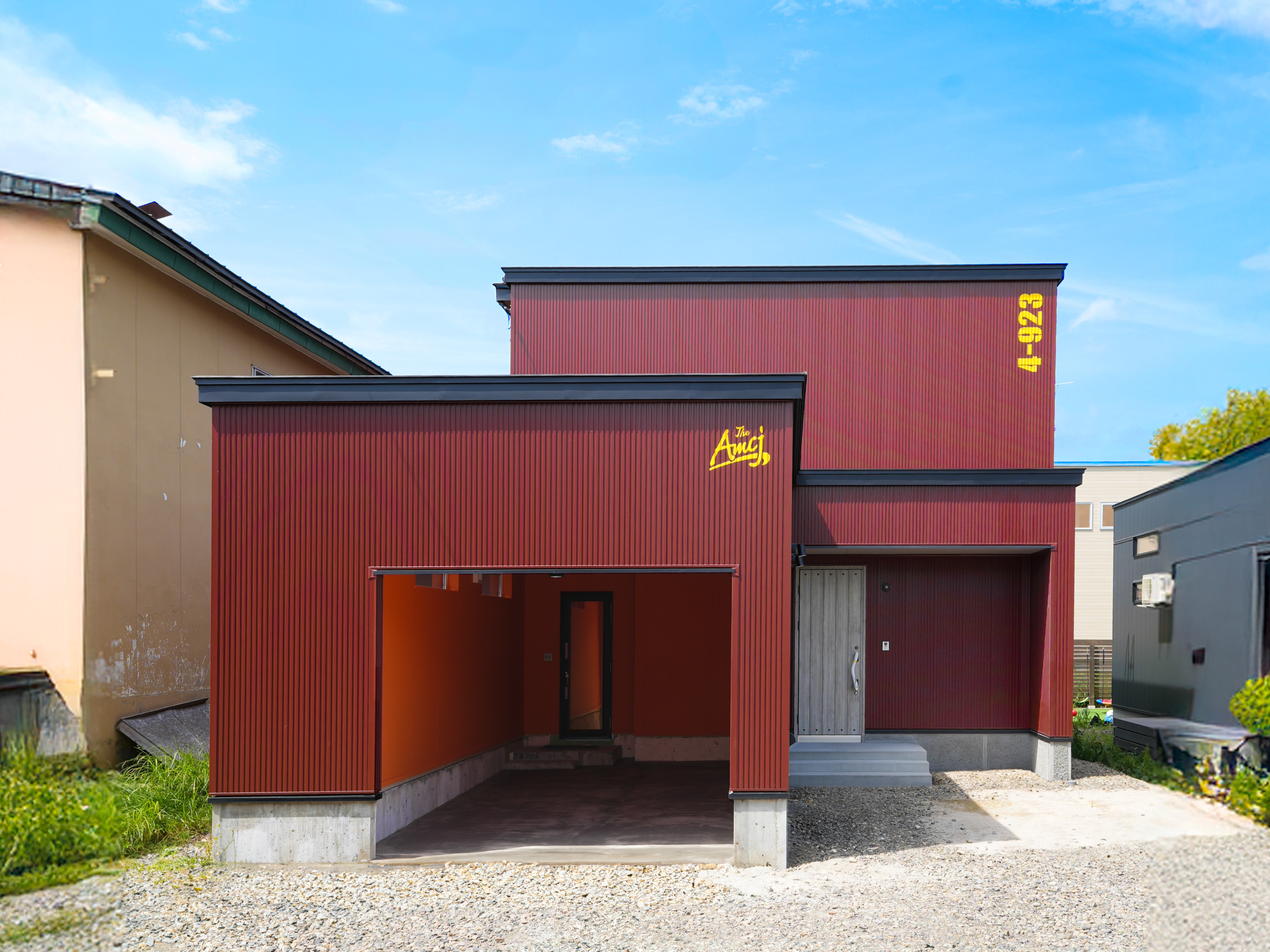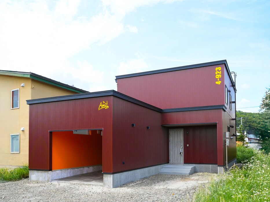 レッドのガルバリウム鋼板の外壁にアメカジオリジナルロゴが映える、アメカジ工務店らしくかっこいい外観。