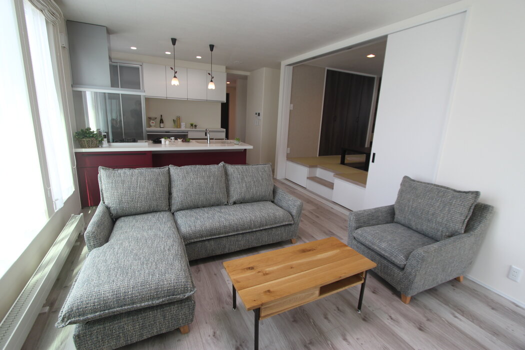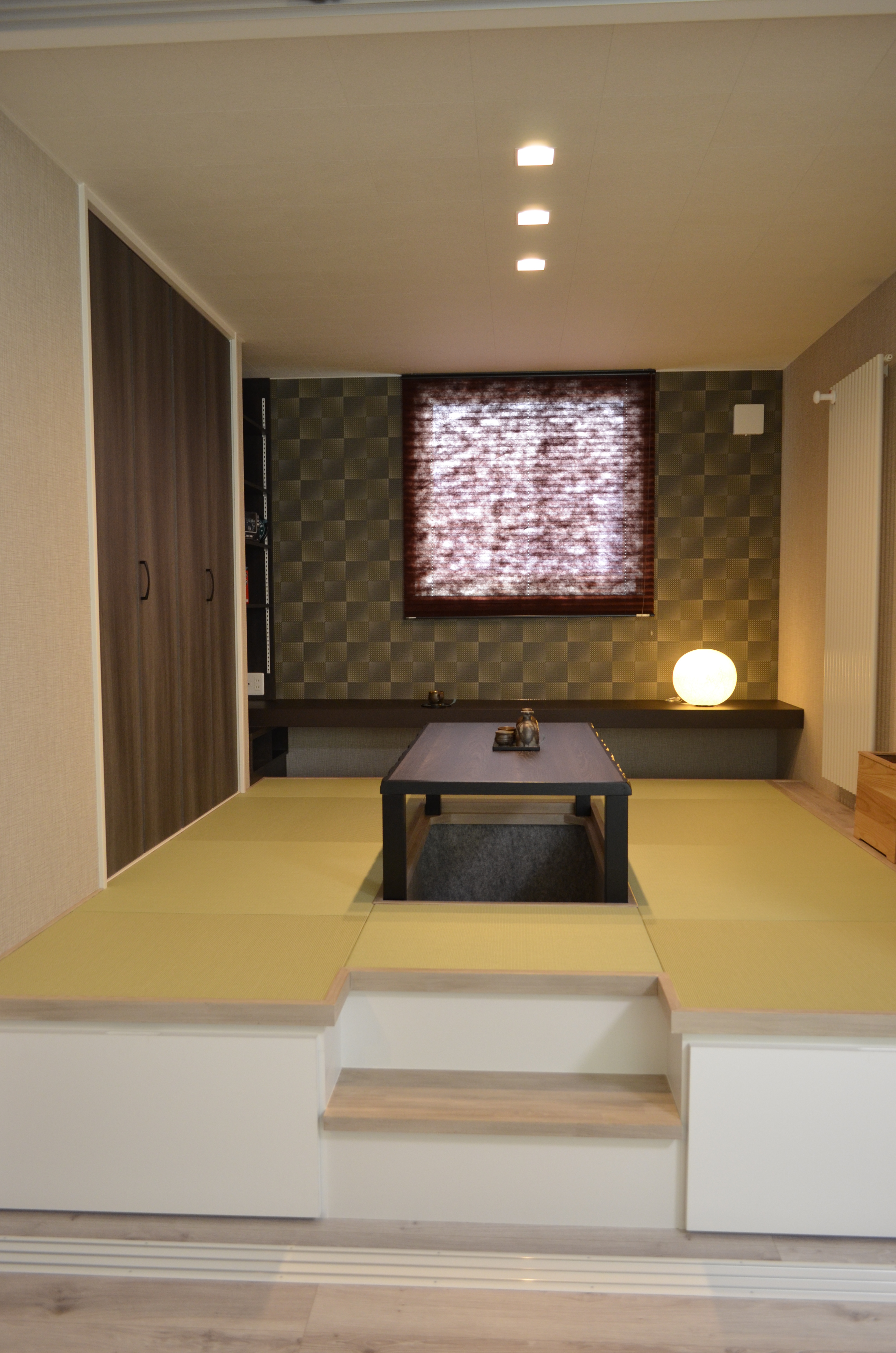 使い勝手抜群の3LDKの平屋♪ キッチンから全体を見渡せ、家族のくつろぎスペースは、リビングと畳スペースの二か所。どちらでくつろいでも、家族の声や気配をいつでも感じることができます。 掘りごたつのある和室にはカウンターを設置してワークスペースとしても。